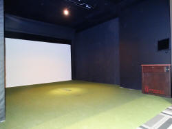 with a bar and tables and chairs, a golf simulator, a wine